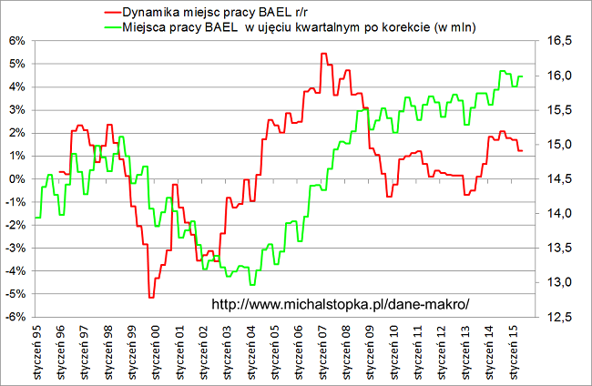 Na zakończenie zaktualizowałem też dane z rynku pracy dotyczące liczby miejsc pracy BAEL bo mamy już dane za drugi kwartał. Widać, że w skali roku mamy nie tylko jednocyfrowe bezrobocie ale i liczba miejsca pracy cały czas zwiększa się (chociaż nie aż tak bardzo jak jeszcze kilka kwartałów temu):