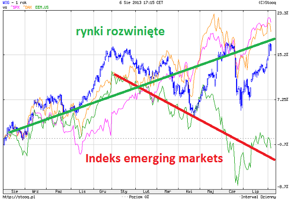Mając na uwadze powyższe spostrzeżenie o zależności Polski od gospodarki UE możemy dojść do wniosku, że porównywanie Polski do giełd Emerging Markets wydaje się być przesadzone, co widać na wykresie poniżej. Polska giełda w ciągu ostatniego roku zachowywała się raczej jak rynki rozwinięte a nie jak rynki rozwijające: