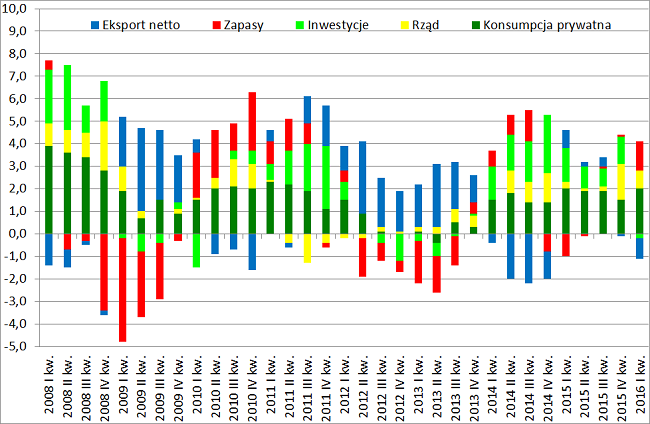 31 sierpnia 2016 roku GUS poda szczegółowe rozbicie składowych PKB. Jak to było po pierwszym kwartale 2016 pokazałem poniżej. Bardzo słabo z inwestycjami ale i bardzo mocny wzrost zapasów: