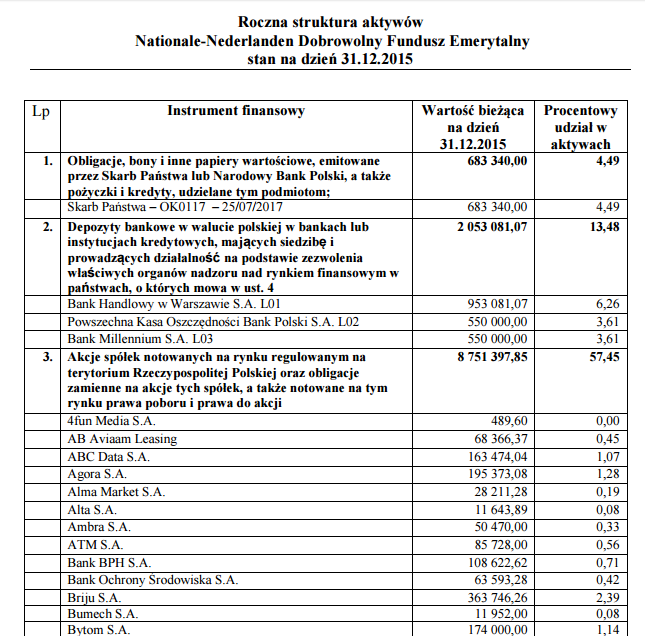 Roczna struktura aktywów Nationale-Nederlanden Dobrowolny Fundusz Emerytalny stan na dzień 31.12.2015